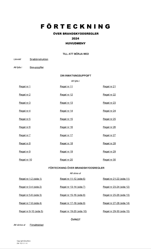 Produkter taggade med 'brandsäkerhet brandplan Brandskyddsregler regeltext förteckning brinna syfte ansvarig person generella regler specifika'