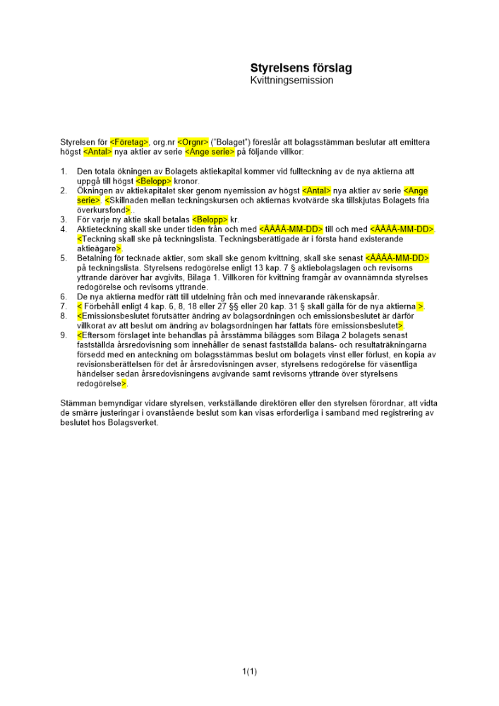Produkter taggade med 'Kvittningsemission kvittning emission förslag styrelse bolagsstämma aktier fordran publikt avstämnin'