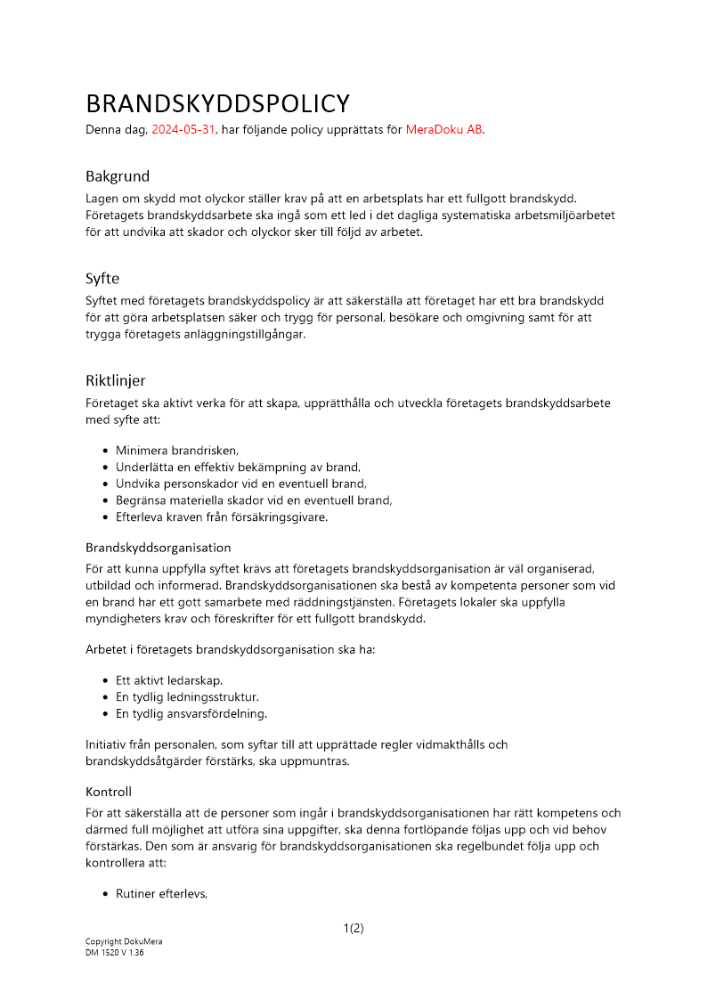 Produkter taggade med 'måldokument brandsäkerhet brandplan Policys Brandskyddspolicy brandskydd systematiskt brandskyddsarbete säkerhetspolicy policy'