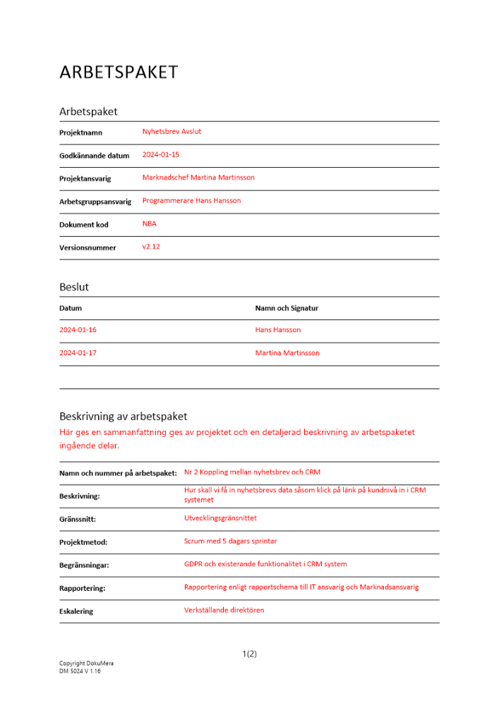 • Arbetsordning, arbetsfördelning och instruktioner