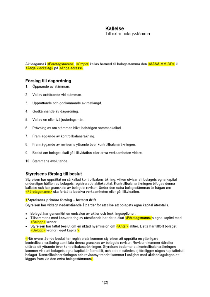 Produkter taggade med 'kallelse extra bolagsstämma förbrukat aktiekapital likvidation aktiebolagslagen'