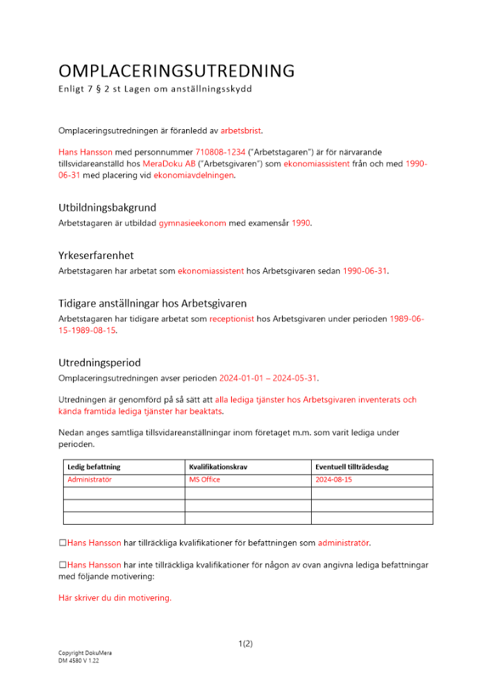 Produkter taggade med 'omplacering utredning omplaceringsutredning arbetsbrist personliga skäl uppsägning'